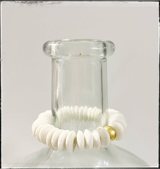 White Ashanti Glass Bead Stretch Bracelet Brass Charm Gold