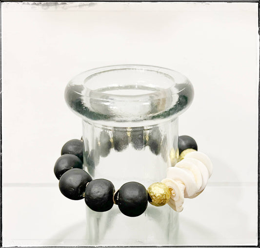 Natural Shell & Recycled Glass Bead Stretch Bracelet- Black