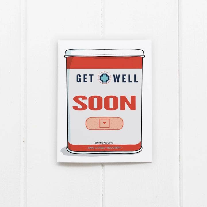 Get Well Soon. This band-aid vintage metal tin box is one of Ramus & Co's favorite cards and a true Best Seller. A classic card that will cheer anyone up! The perfect card to spread happiness and wellness.