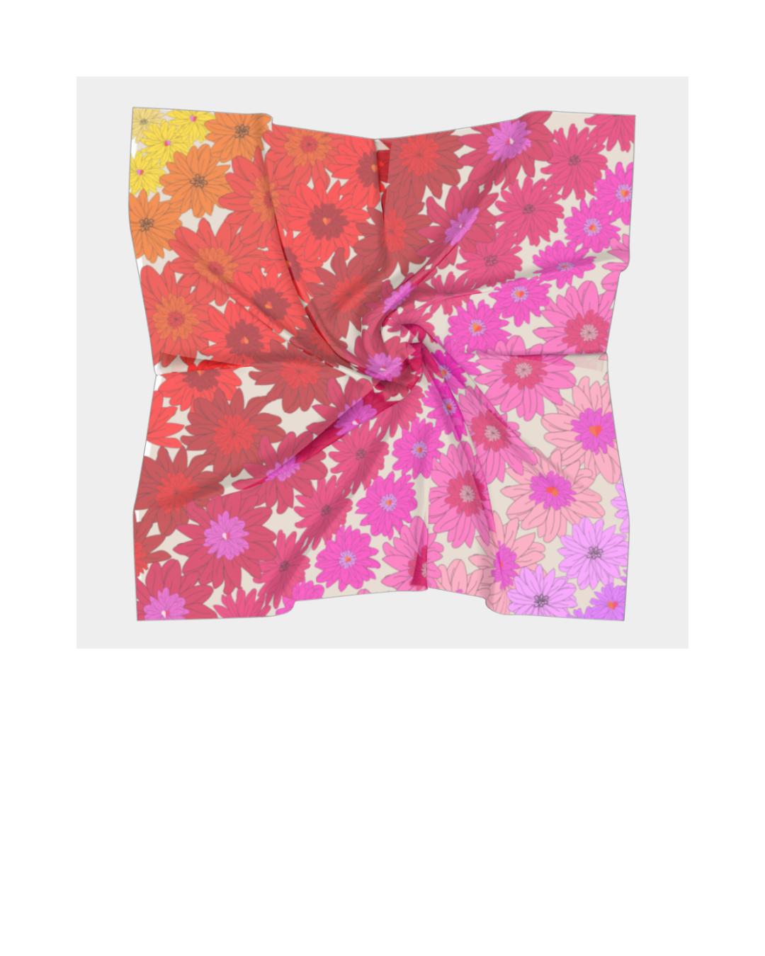 This scarf was inspired by the markets in India. The marigolds were in full bloom and in a rainbow of colors. We designed this to highlight different colors depending on which way you tie it. It's the perfect transitional floral from Summer to Fall.